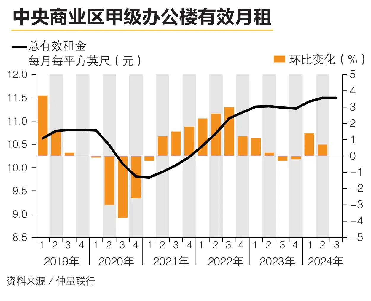 在租金方面,由于空置率攀升,办公楼租户抗拒租金上调的情况加剧。仲量联行的研究显示,中央商业区甲级办公楼的有效总租金,今年第三季维持在每平方英尺价11.50元。第二季的租金环比增长0.7%,比第一季的1.4%明显放缓许多。