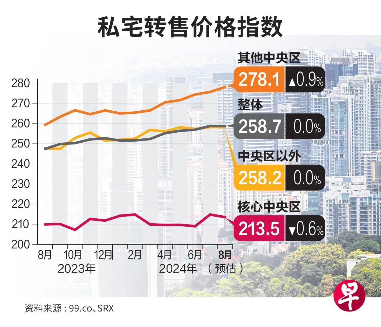 在转售私宅的价格方面,8月份的价格持稳,与去年同期相比则增长4.6%。按细分市场来看,其他中央区的转售价比7月上涨0.9%,中央区以外的价格持平,而核心中央区的转售私宅的价格则下跌0.6%。