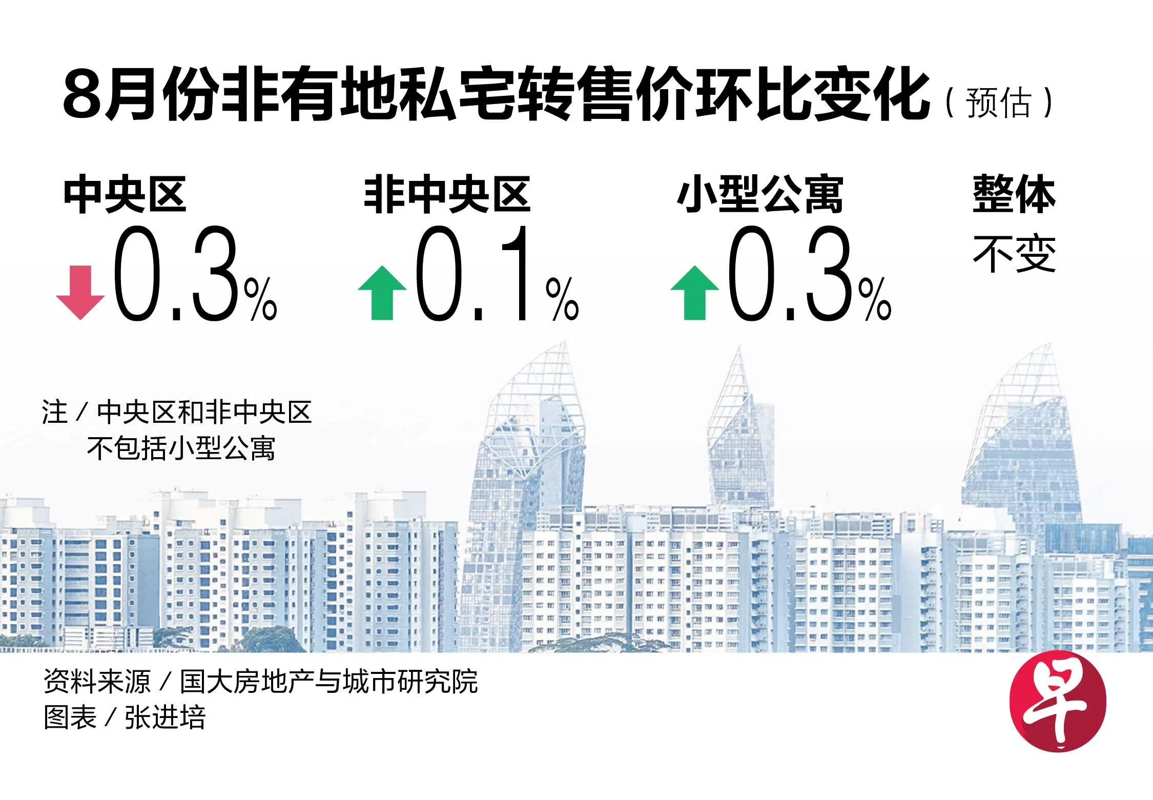 7月的整体转售价格指数,从预估的1%上修至1.1%。不包括小型公寓的中央区非有地私宅转售价格指数,从0.8%上调至1%;非中央区指数也从1%提高至1.1%;小型公寓转售价格指数从0.5%上升至0.6%。