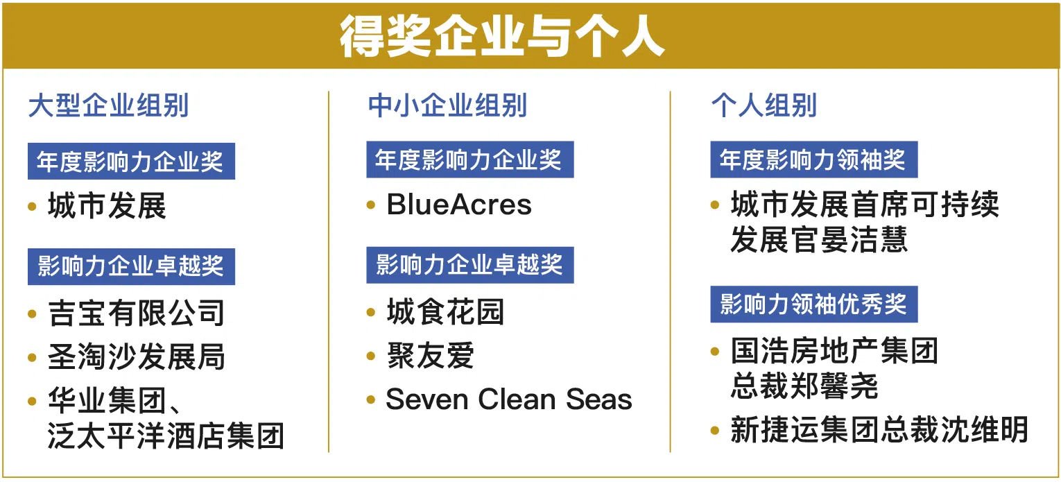 个人组别中,城市发展首席可持续发展官晏洁慧是本地倡导可持续发展的先锋人物,因而荣膺“年度影响力领袖奖”(Impact Leader of the Year)。
