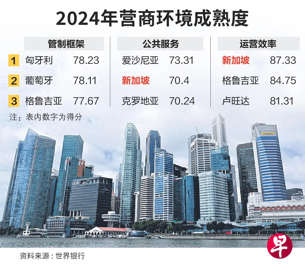 世界银行发布的《2024年营商环境成熟度报告》(Business Ready 2024)显示,新加坡、匈牙利和爱沙尼亚在三项类别中名列前茅,其中新加坡在运营效率方面得分最高。