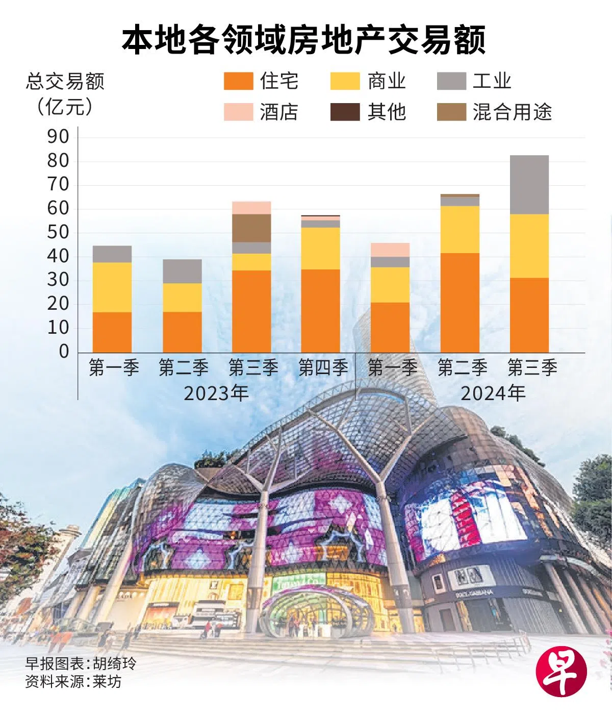 莱坊(Knight Frank)发布的最新报告显示,今年第三季住宅和商业房地产的大宗交易总额达83亿元,环比增长24.8%,较去年同期的64亿元也有所上升。