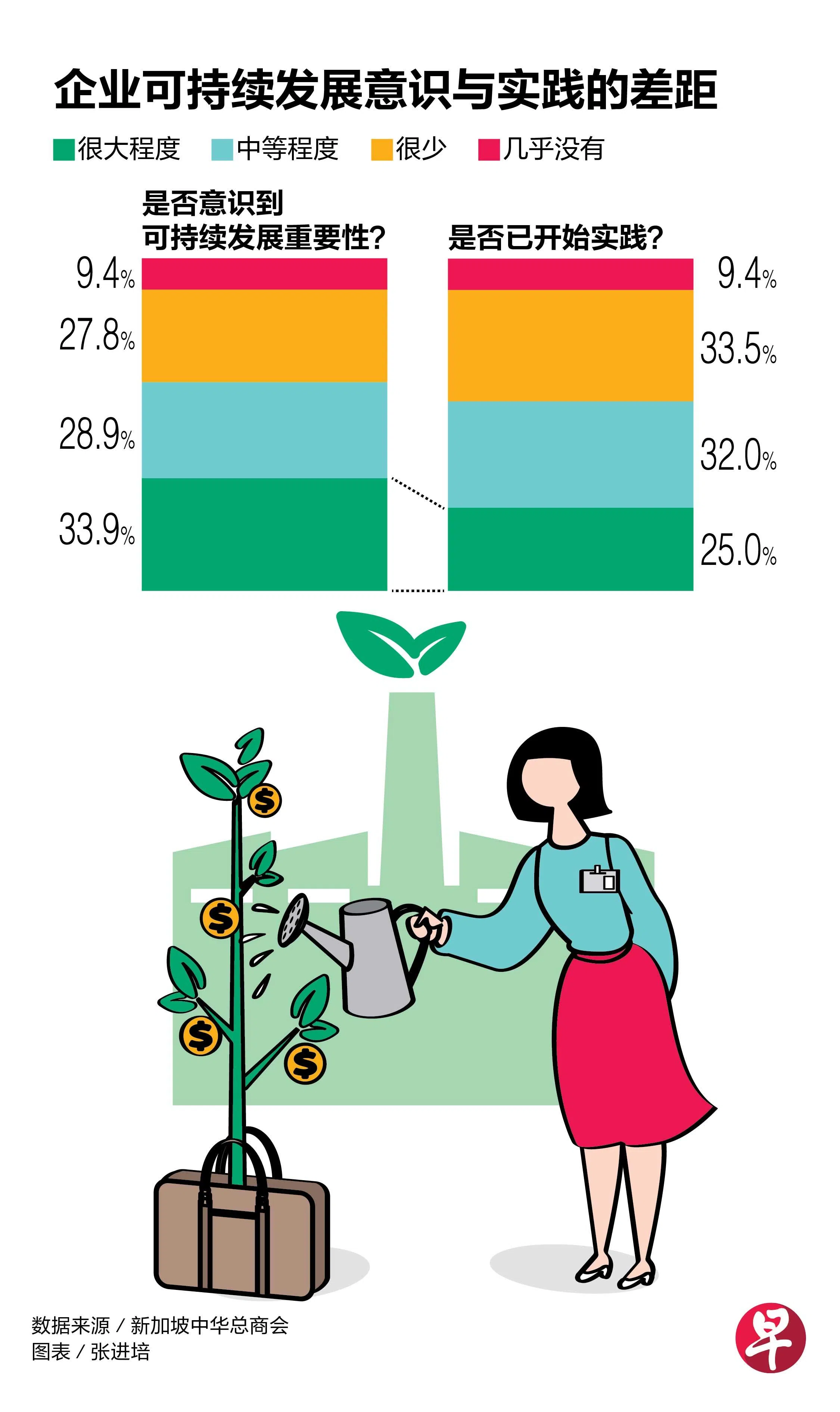 也担任可持续发展联盟主席的李坚辉说,新加坡中华总商会的最新调查显示,63%的企业认同可持续发展的重要和它带来的竞争优势,但只有57%的企业将可持续发展纳入商业战略和模式中。目前,企业面临的主要挑战包括可持续实践的高成本、短期生存压力的优先考虑,以及相关资源的匮乏。