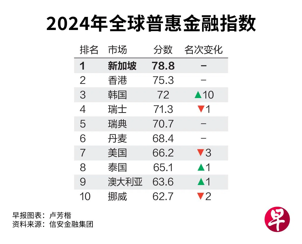 新加坡综合得分升至78.8,连续第三年被评为全球金融包容性最强的市场。香港和韩国分别以75.3分和72分,位居第二和第三,其中韩国排名大幅上升十个名次;去年排第三的瑞士,今年排第四。