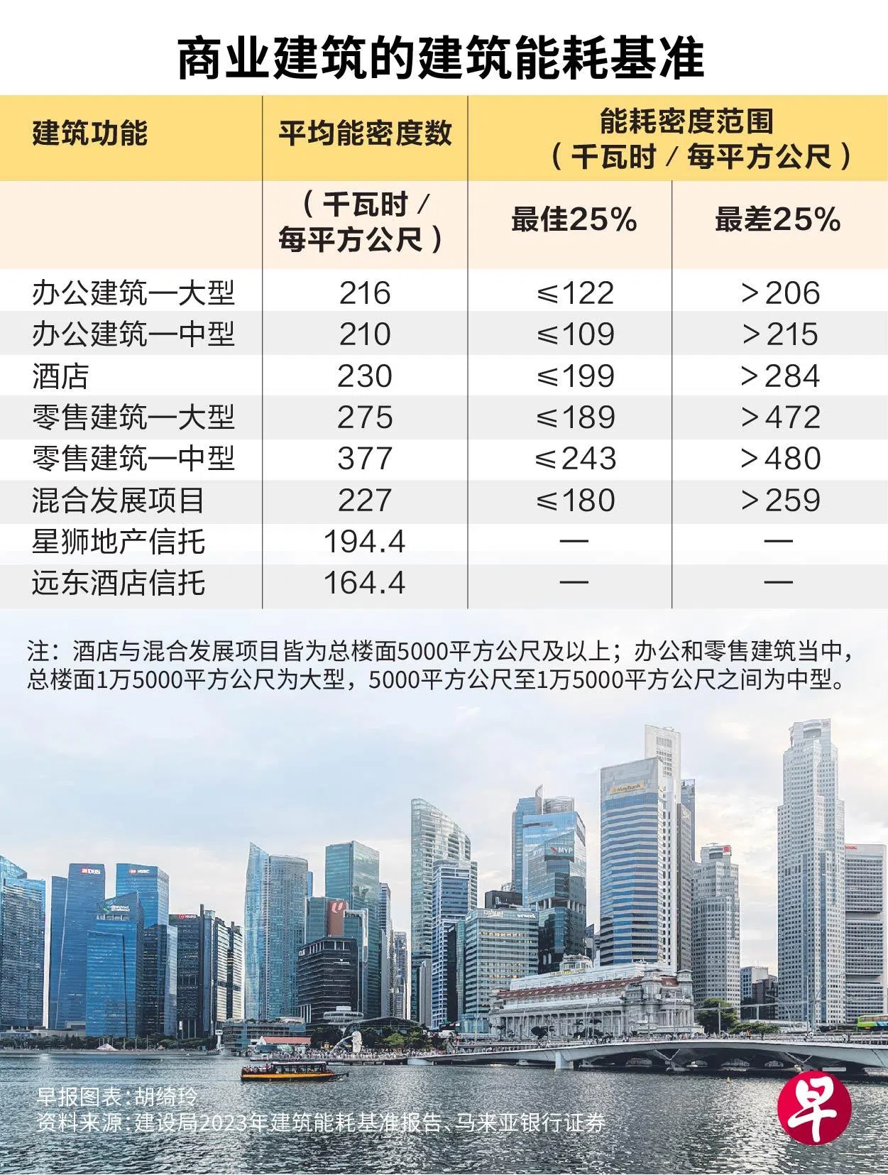 在新制度下,各类建筑中能耗密度连续三年在最差25%的建筑物(这个门槛五年后再检讨),须进行能源审计,并落实措施把能耗降低至少10%。新加坡建设局每年发布建筑能耗基准报告,2023年的报告便从业主提交的1058栋建筑的能耗情况,统计出不同类建筑组别的能耗密度和四分位数,可供利益相关者参考。