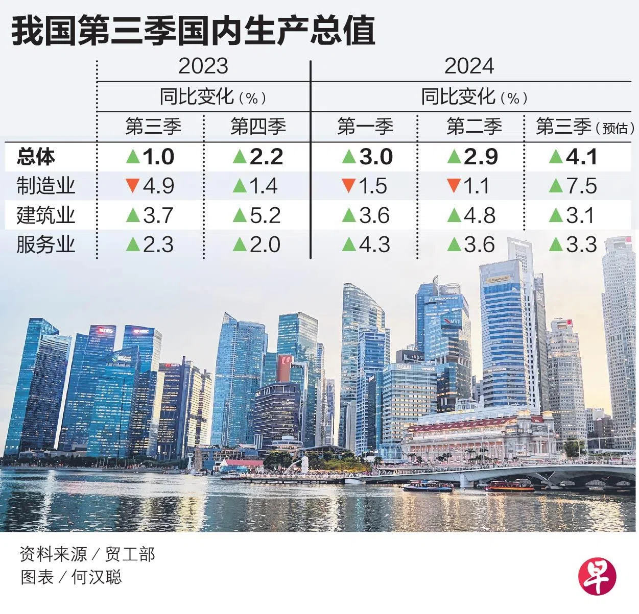贸工部星期一(10月14日)发布的初步预估数据显示,经季节性调整后,第三季国内生产总值(GDP)环比增长2.1%,远高于第二季的0.4%。彭博社此前收集的数据显示,经济师对第三季的同比增长预期是3.8%。