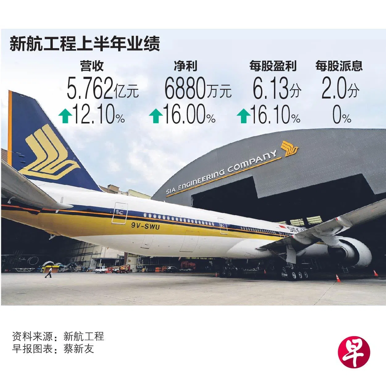 因飞机维护与翻新需求继续受良好航空旅行需求推动,新航工程(SIA Engineering)截至9月底上半年集团净利同比扬升16.0%至6880万元,每股盈利同比增加16.1%至6.13分。