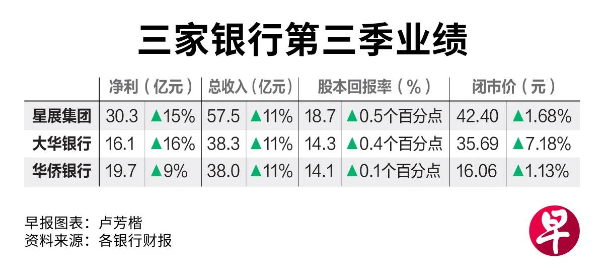 三家银行的第三季净利都取得比市场预测更高的同比增长,星展和大华有双位数。华侨增长9%,也高出市场预测的中间个位数增长。