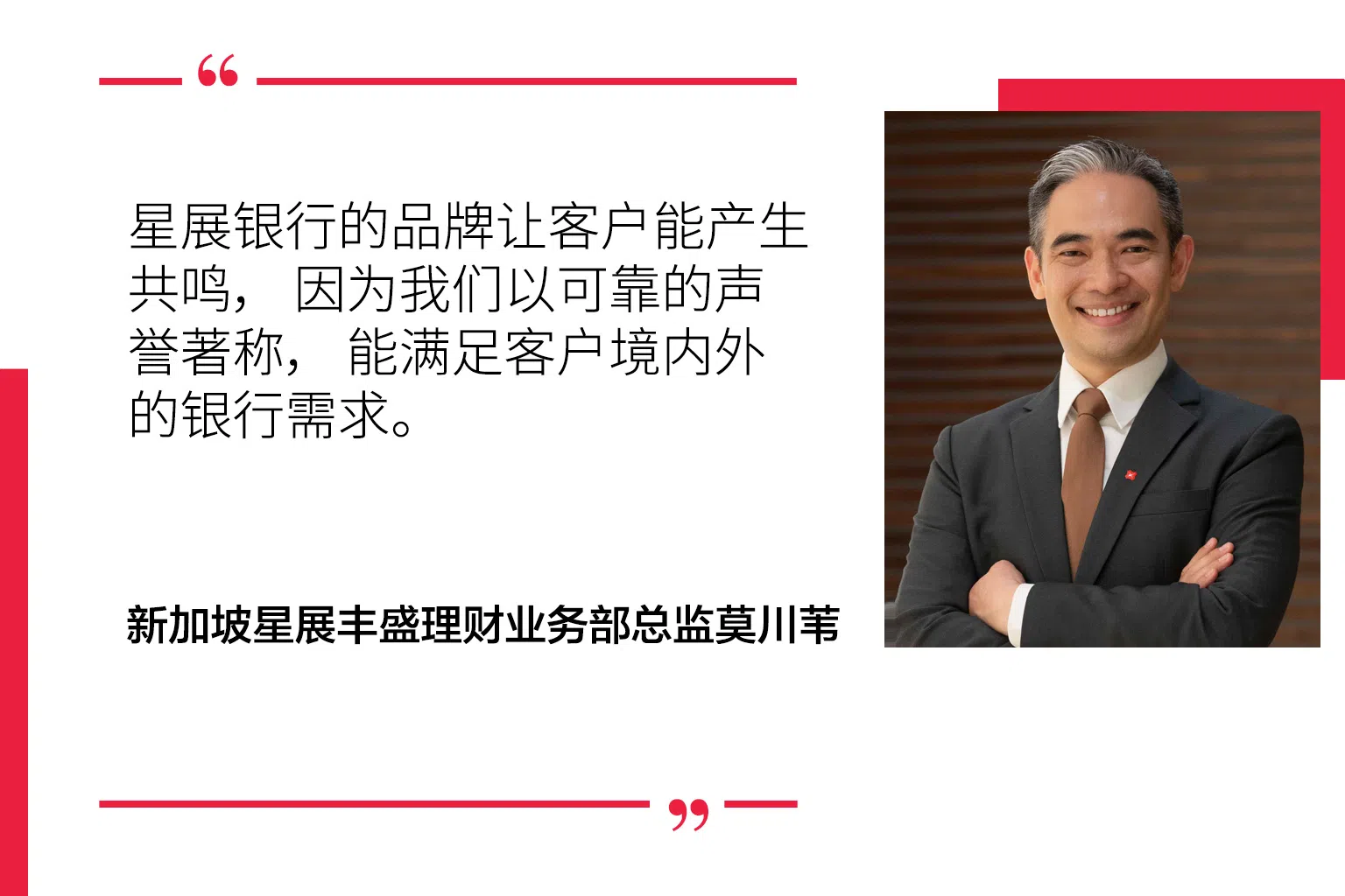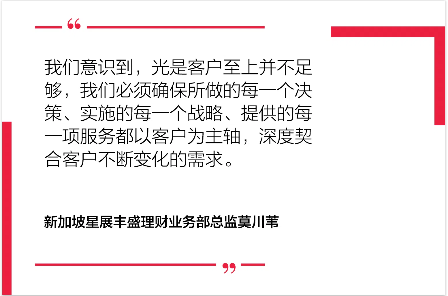 莫川苇指出:“以客户为主轴是我们存在的核心关键。在星展丰盛理财,我们要做到为“客户痴迷”的程度。”