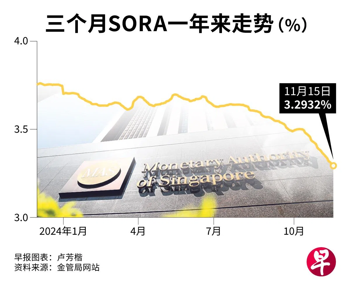 房屋贷款、商业贷款参照的新加坡基准利率三个月新元隔夜利率(SORA),截至上星期四(11月14日)为3.2932%,比9月美联储降息前低24个基点,也是去年3月来的最低水平。