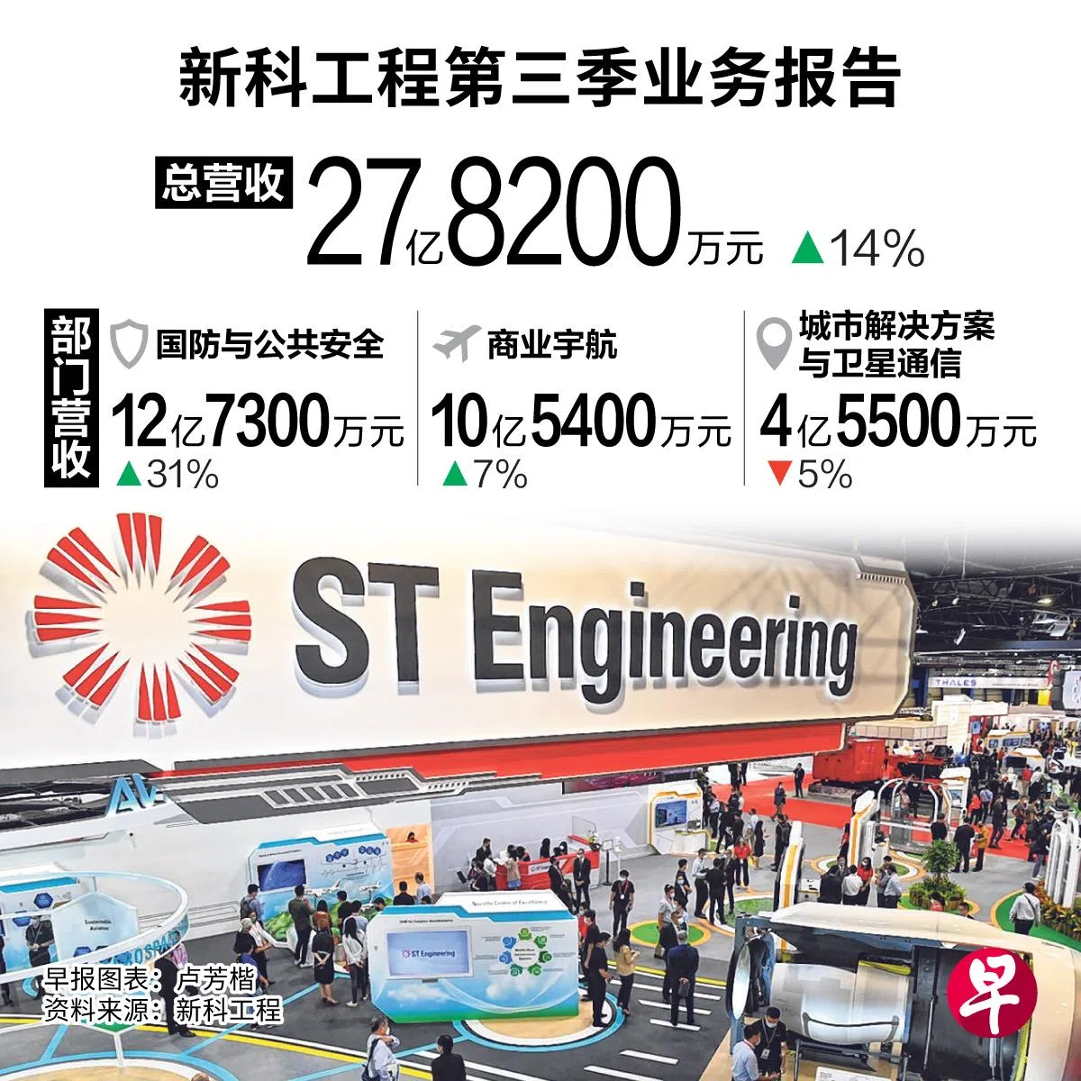 新科工程(ST Engineering)今年第三季营收增长14%至27亿8200万元,高于上一季的24亿3300万元。