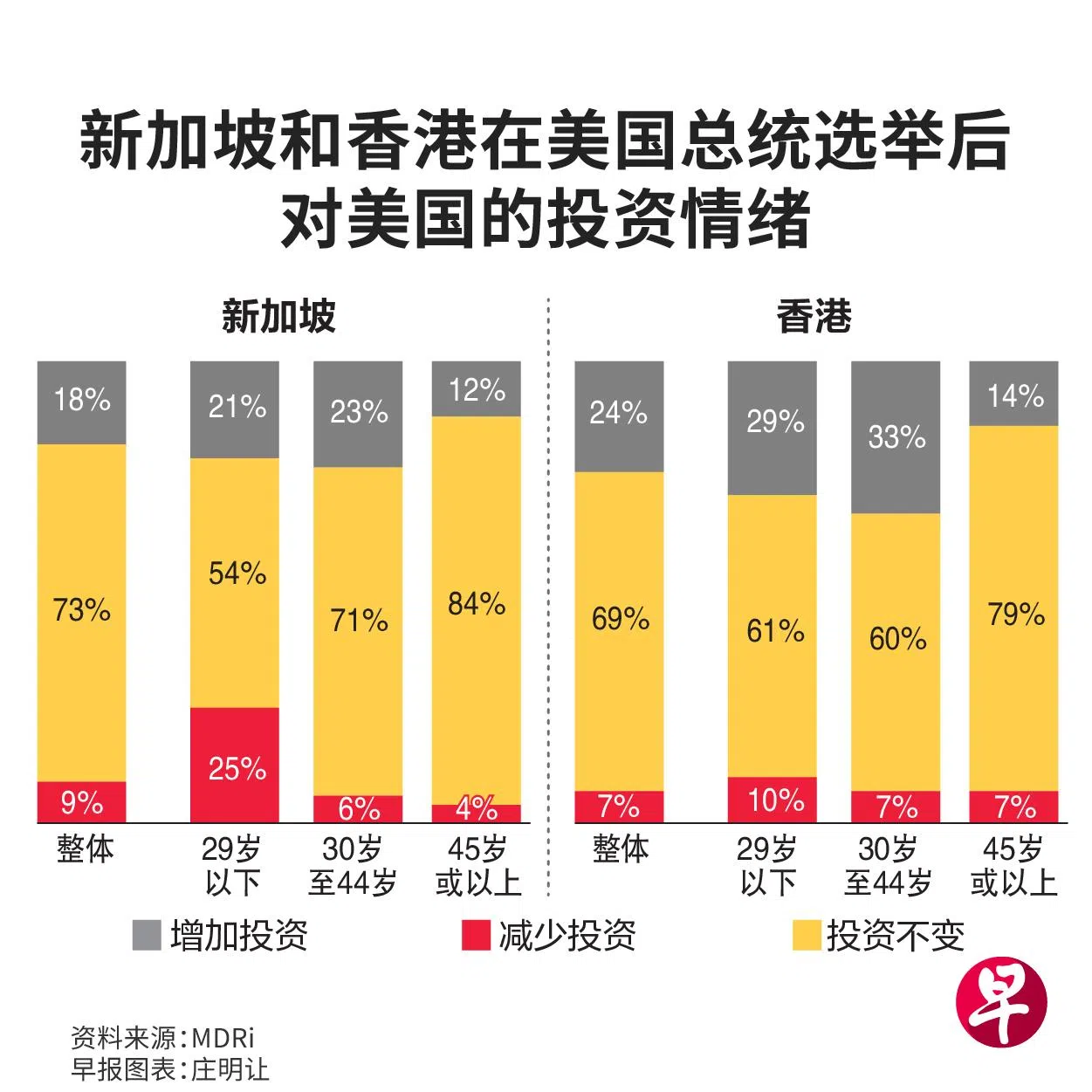 若看个别年龄层对美国的投资情绪,相较于45岁或以上的受访者,Z世代(Gen Z)和千禧世代(Millennials)倾向在美国总统选举后,增加在美国市场的投资。新加坡和香港都出现这个现象。