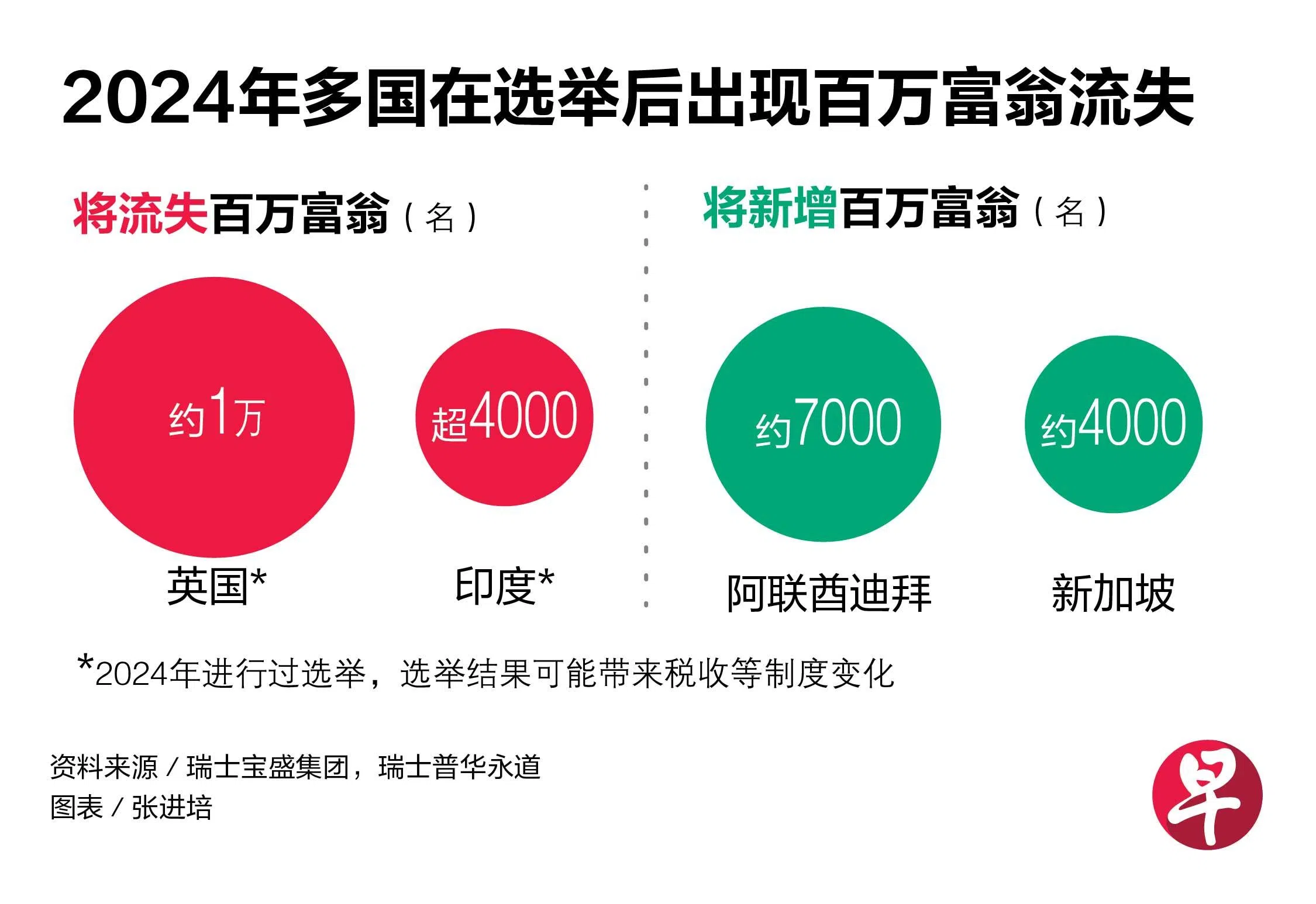 瑞士宝盛集团(Julius Baer)星期一(11月18日)发布的2024年《瑞士宝盛家族晴雨表》报告显示,英国和印度今年或分别流失大约1万名、4000名百万富翁;而阿联酋的迪拜和新加坡,预计新增的百万富翁人数分别为7000人与4000人。