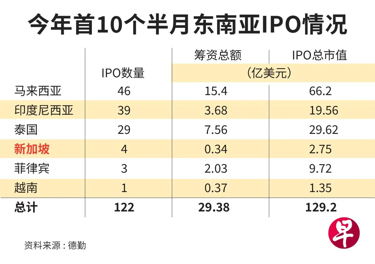 今年首10个半月,东南亚首次公开售股(IPO)市场共完成122宗IPO,筹资约30亿美元(约40亿1700万新元)。其中仅四宗来自新加坡,筹资约3400万美元。