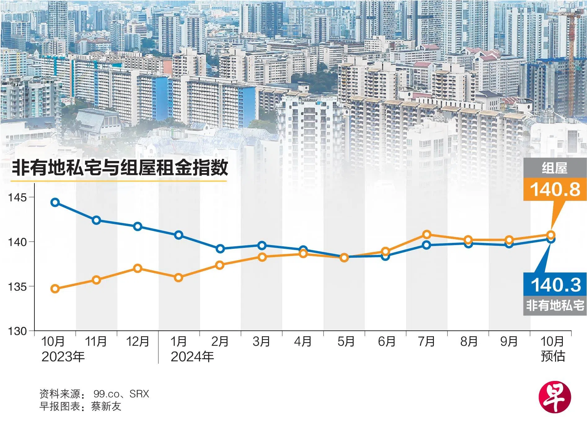 房地产网站99.co和新加坡房地产联合交易网(SRX)星期三(11月20日)发布的预估数据报告显示,本地私宅10月的整体租金与9月相比上扬0.5%,若与去年同期比较,私宅市场的租金整体下跌2.8%。