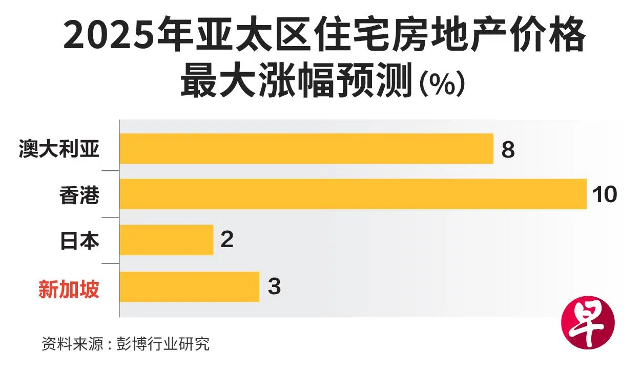 彭博行业研究(Bloomberg Intelligence)的报告也指出, 经过今年第三季度的下跌后,新加坡房价应会随着利率下降而上涨,预计明年涨幅3%。