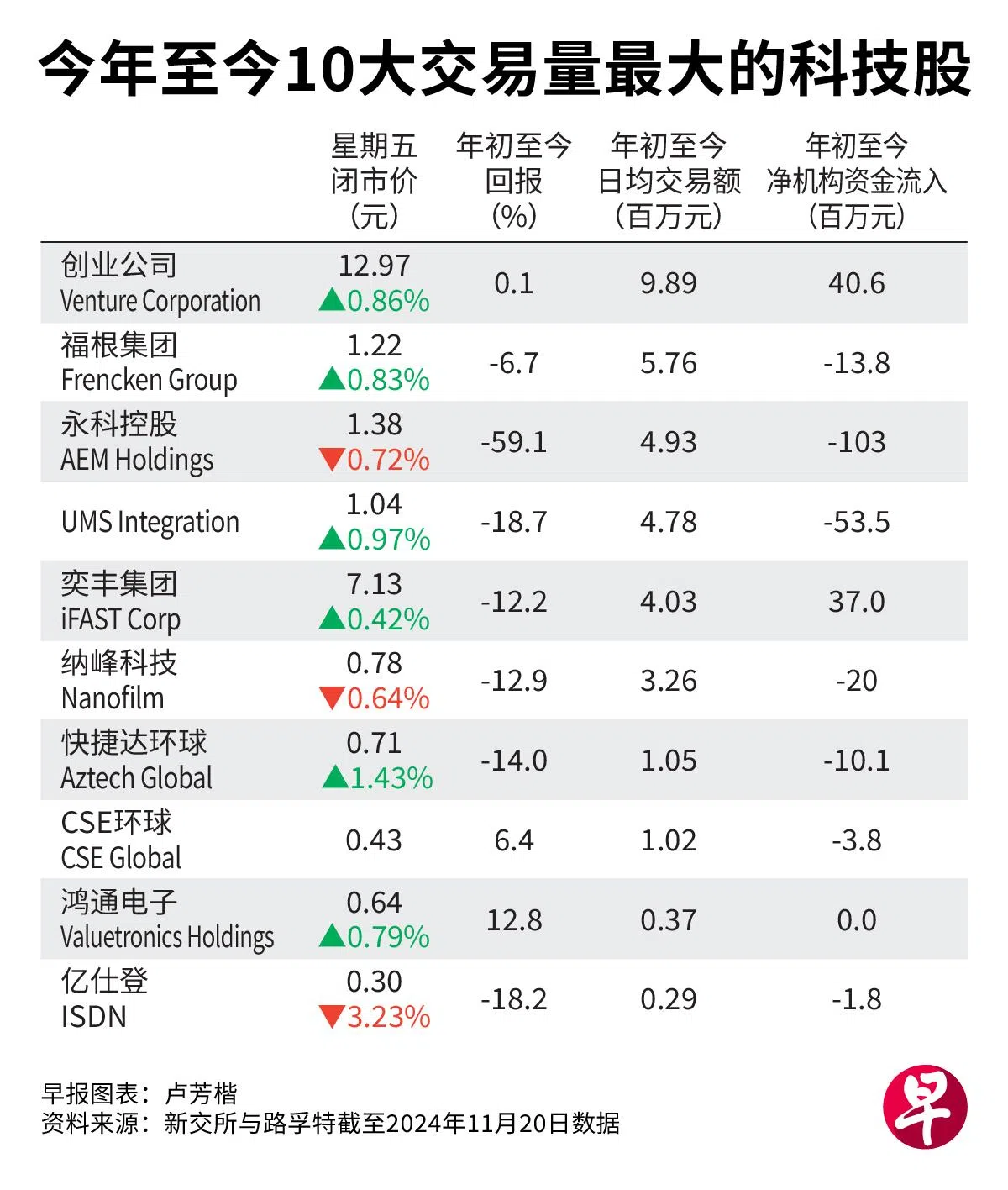 报告说,整体市场情绪偏向保守,多数科技股的估值因市场周期性疲软而下降。同时,10只股票中,七只年初至今的总回报率为负,仅有鸿通电子、创业公司(Venture)和CSE环球三只取得正回报。