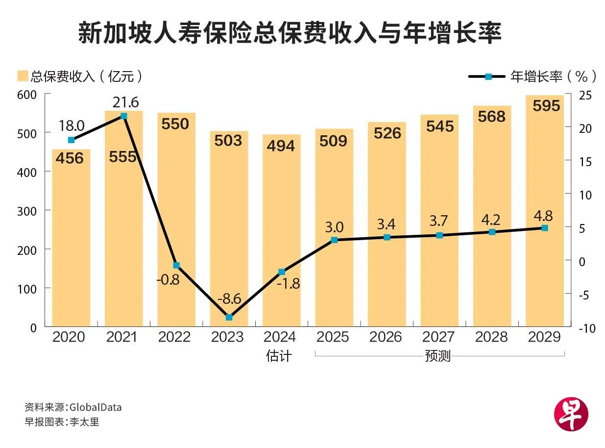 一份报告显示,新加坡人寿保险业的总保费收入(Gross Written Premium)今年估计达494亿元,比2023年的503亿元低1.8%,也低于2021年和2022年的555亿元和550亿元。
