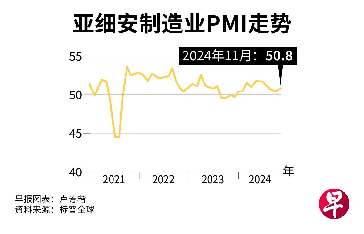 标普全球(S&P Global)星期一(12月2日)发布的报告显示,11月份亚细安制造业采购经理指数(PMI)为50.8,是六个月来首次增长,也是近三个月的最高水平,显示亚细安制造业经营状况持续改善。