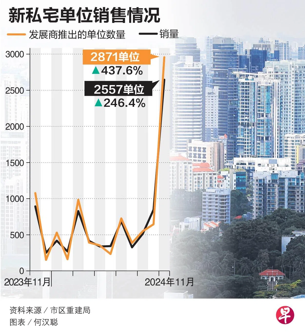 根据市区重建局在星期一(12月16日)发表的文告,若不包括执行共管公寓(EC), 11月的新私宅销量为2557个单位,比10月高出246.4%。