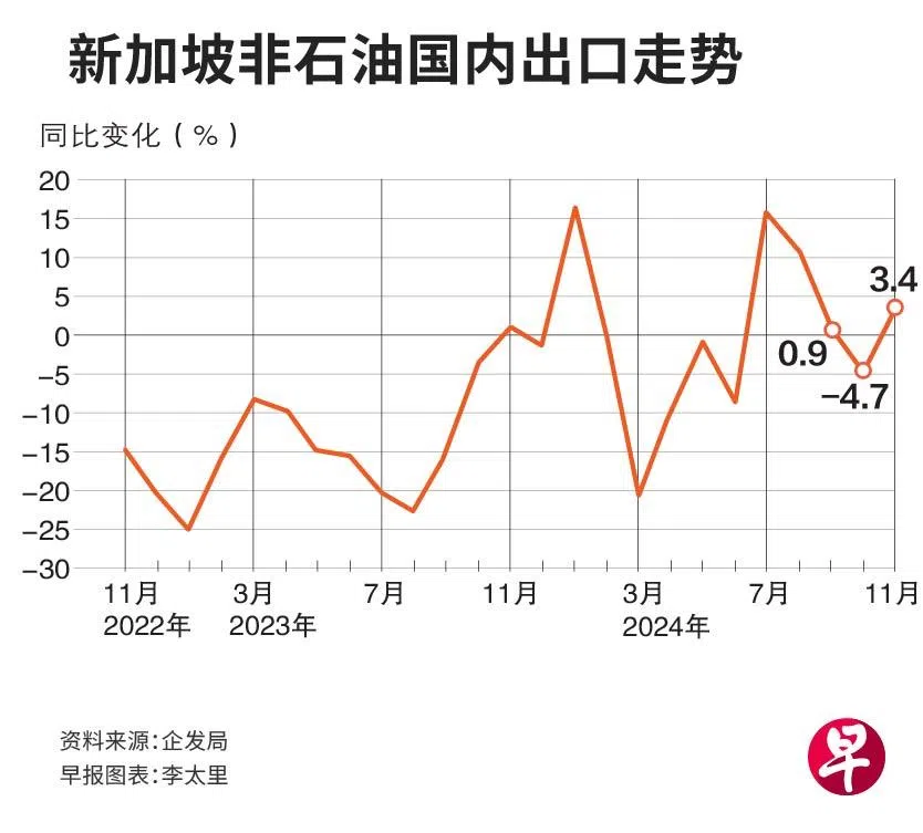 新加坡企业发展局星期二(12月17日)公布的最新数据显示,我国11月非石油国内出口同比增长3.4%,逆转了前一个月的4.7%跌势。彭博社此前的经济师调查预估,11月非石油国内出口将下滑1%。