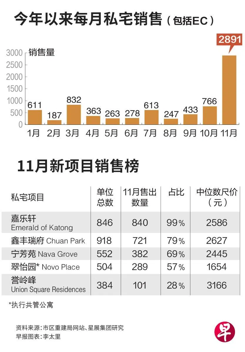 11月强劲销售数据,主要由六个新项目开盘所推动,橙易集团(OrangeTee Group)首席研究与战略总监孙燕清接受《联合早报》访问时指出,由于缺乏显著的新盘推出,今年全年新私宅销售其实萎靡不振,前三季销量只达3049个,是自市建局2004年发布数据以来近20年最差的前三季表现。