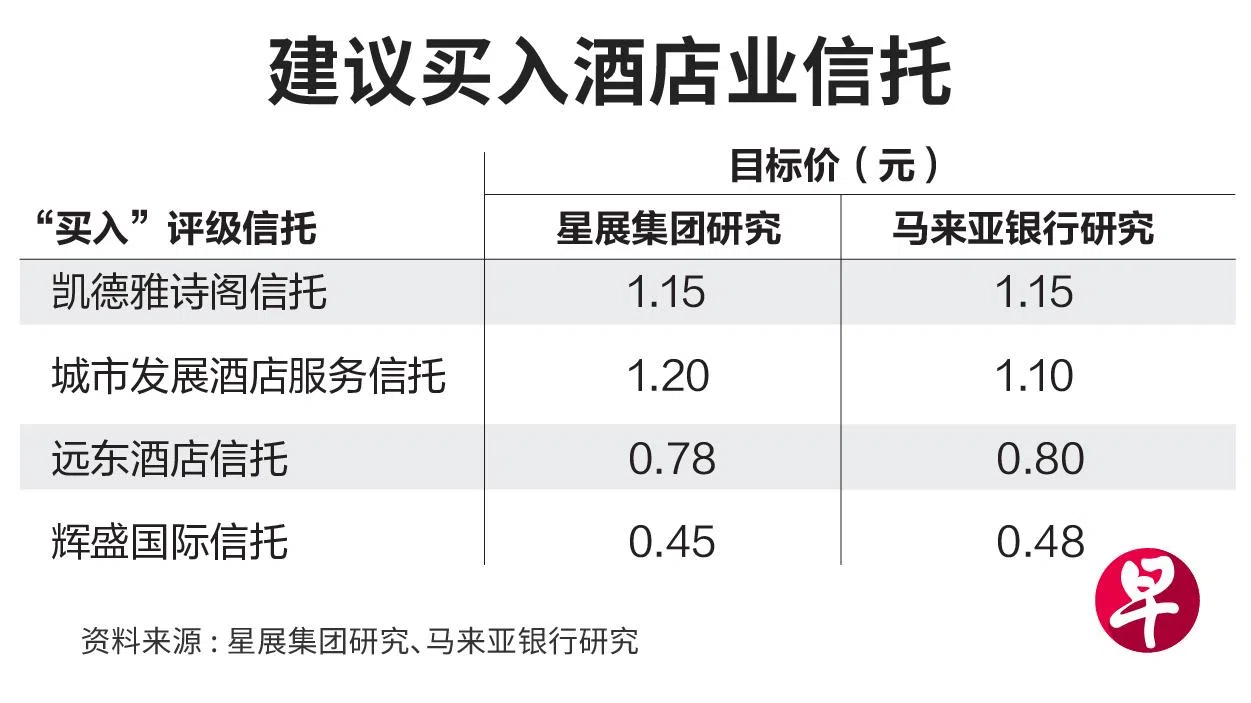 此外,星展与马银行也给予城市发展酒店服务信托(CDL Hospitality Trusts)、远东酒店信托(Far East Hospitality Trust)和辉盛国际信托(Frasers Hospitality Trust)买入评级。