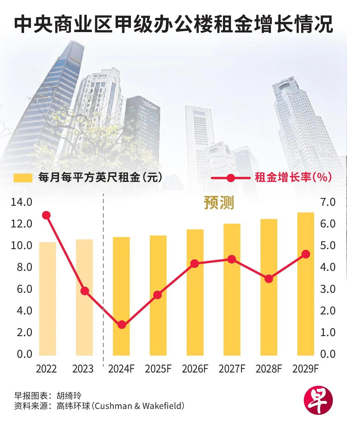 另一方面,高纬环球(Cushman & Wakefield)在报告中预计,中央商业区甲级办公楼租金增长率会从今年的1%到2%,在明年上升至2%到3%。这是受新供应趋紧、利率担忧消退以及商业情绪增强带来的强劲需求所推动。