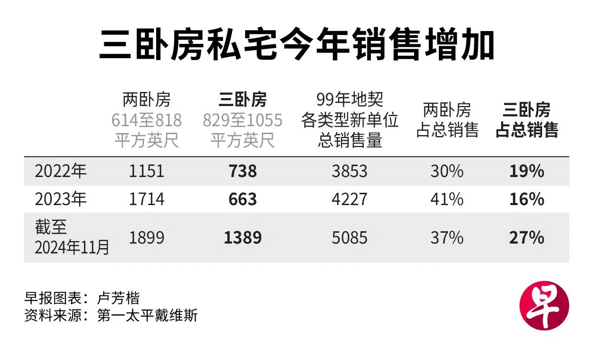 第一太平戴维斯(Savills)提供给《联合早报》的数据显示,虽然小型私宅,如两卧房的单位仍然是买家购入最多的房型,但较大面积的三卧房单位的销量,在今年前11个月有增加的趋势,在总销量的占比激增至27%。