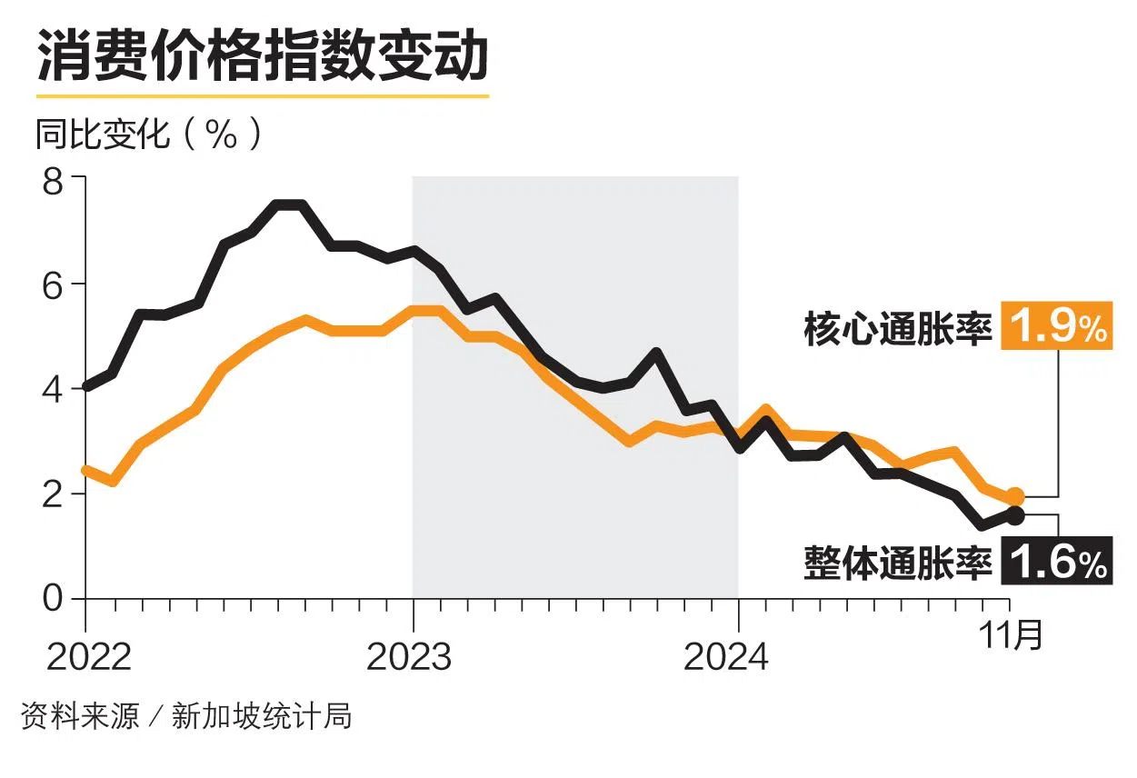 食品与服务业通胀缓解,使新加坡11月份核心通胀率下降至1.9%,低于彭博社此前调查预测的2.1%,也创下三年来最低水平。