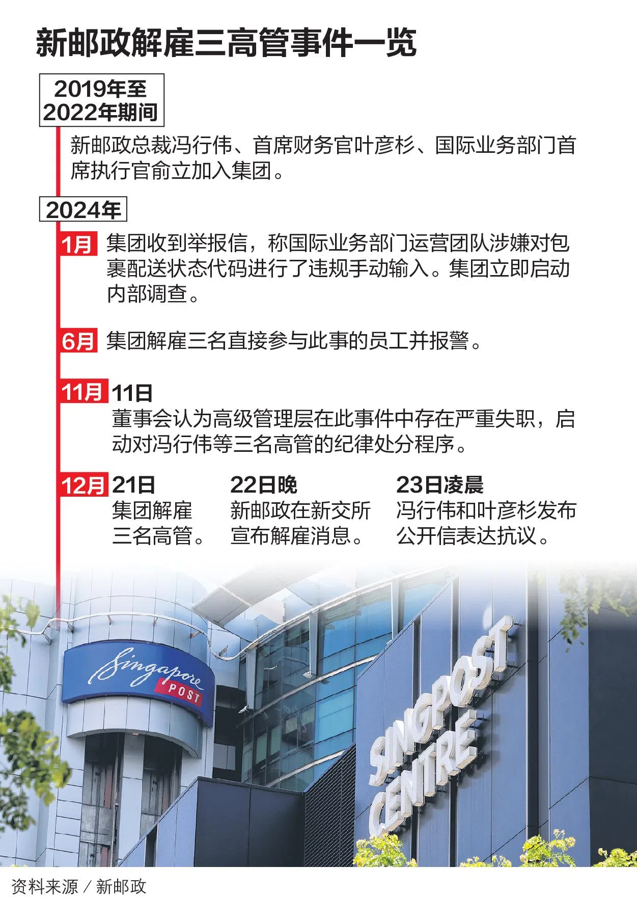 新邮政星期天(22日)晚上向新加坡交易所提交文件,宣布集团总裁冯行伟、首席财务官叶彦杉,以及国际业务部门首席执行官俞立,于12月21日起被即刻解雇。