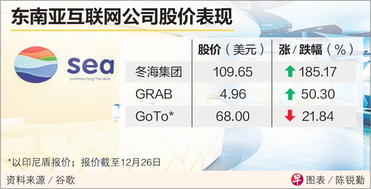 冬海集团(Sea Ltd)第二季已转亏为盈,第三季净利达1亿5332万美元(2亿零500万新元),股价今年来(至12月26日)爆涨185.17%至109.65美元;Grab控股(Grab Holdings,简称Grab)第三季才开始转亏为盈,取得1500万美元季度盈利,今年来股价大涨50.30%至4.96美元。