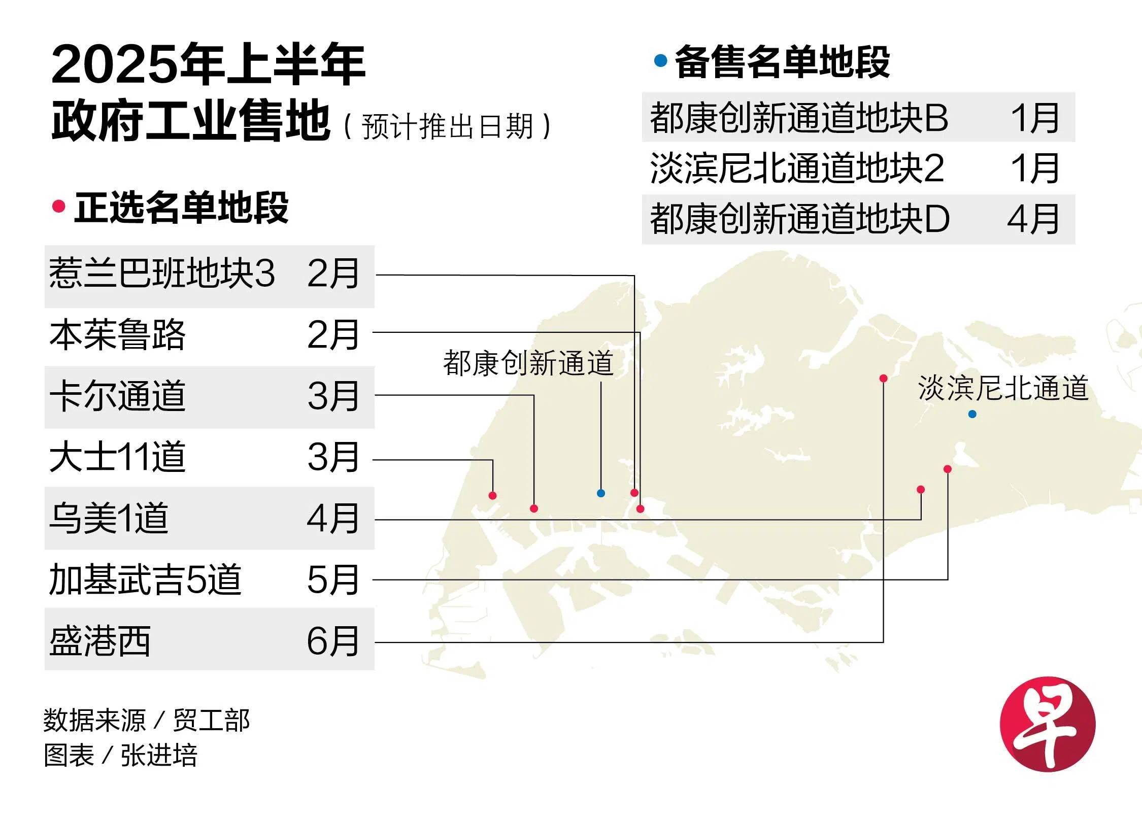 根据贸工部星期一(12月30日)发布的文告,明年上半年的七幅正选地段,位于惹兰巴班(Jalan Papan)、本茱鲁路(Penjuru Road)、卡尔通道(Gul Drive)、大士道(Tuas Avenue)、乌美道(Ubi Avenue)、加基武吉(Kaki Bukit),以及盛港西。