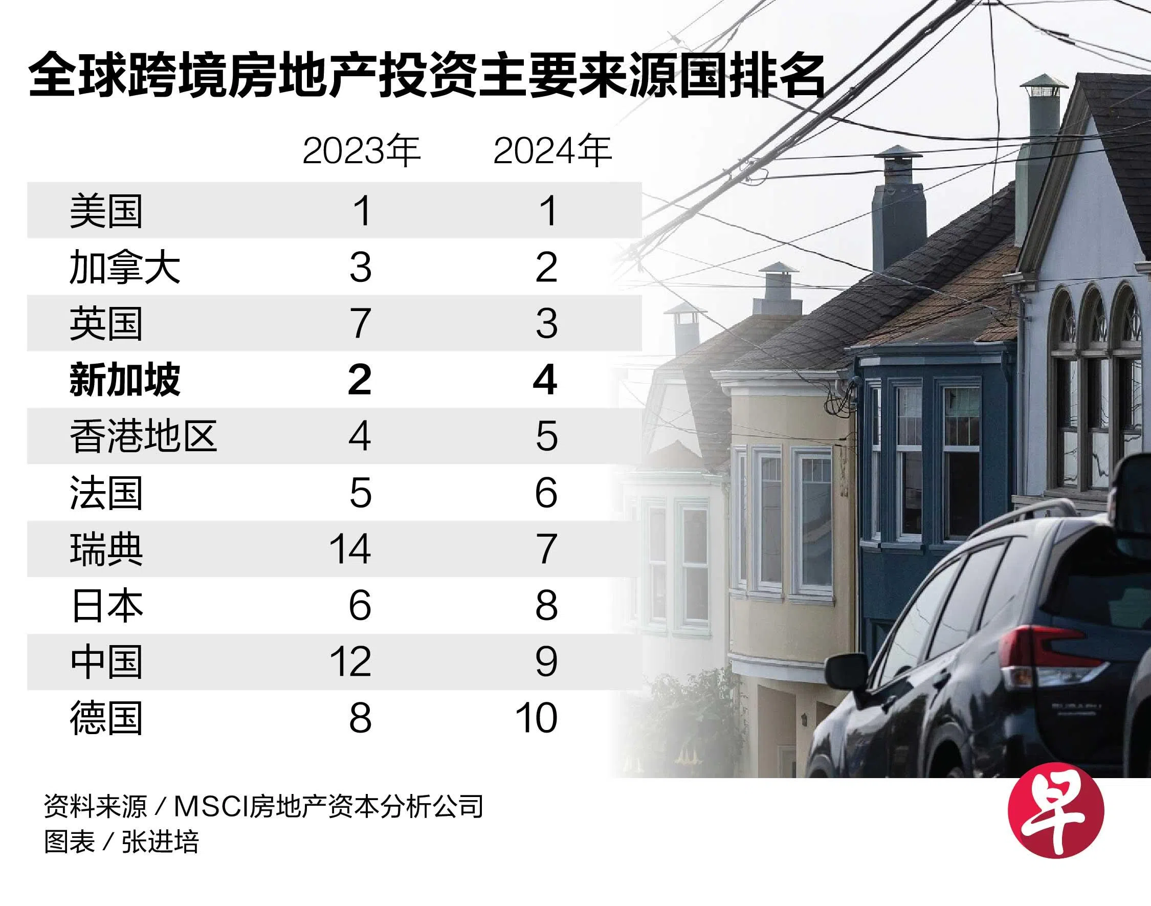 本地投资者的2024年海外房地产投资额较2023年大幅减少54%,新加坡在海外房地产投资的排名,也从2023年的全球第二下滑至第四位,位居美国、加拿大和英国之后。