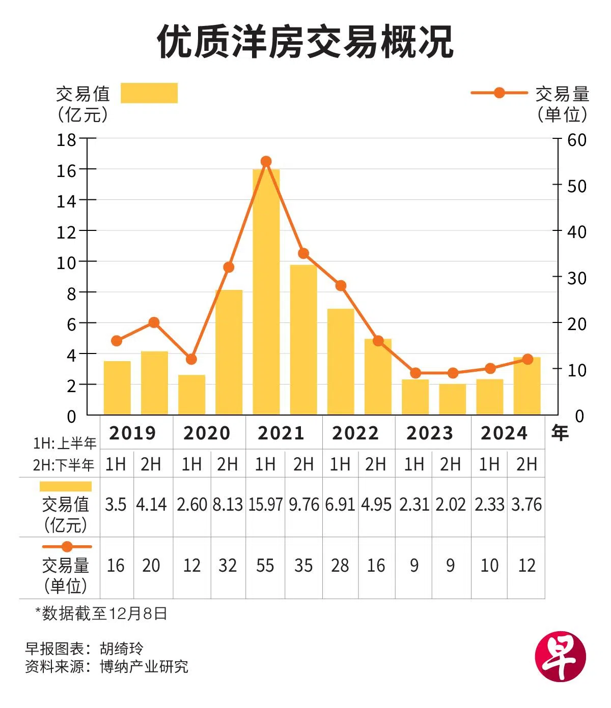 或因为卖家重新斟酌叫价,优质洋房在2024年下半年恢复销售势头,交易量和交易值都比上半年高。截至2024年12月8日(下同),共有12笔优质洋房交易,总交易值达3亿7600万元,比上半年10宗交易2亿3300万元的总值,高出61%。