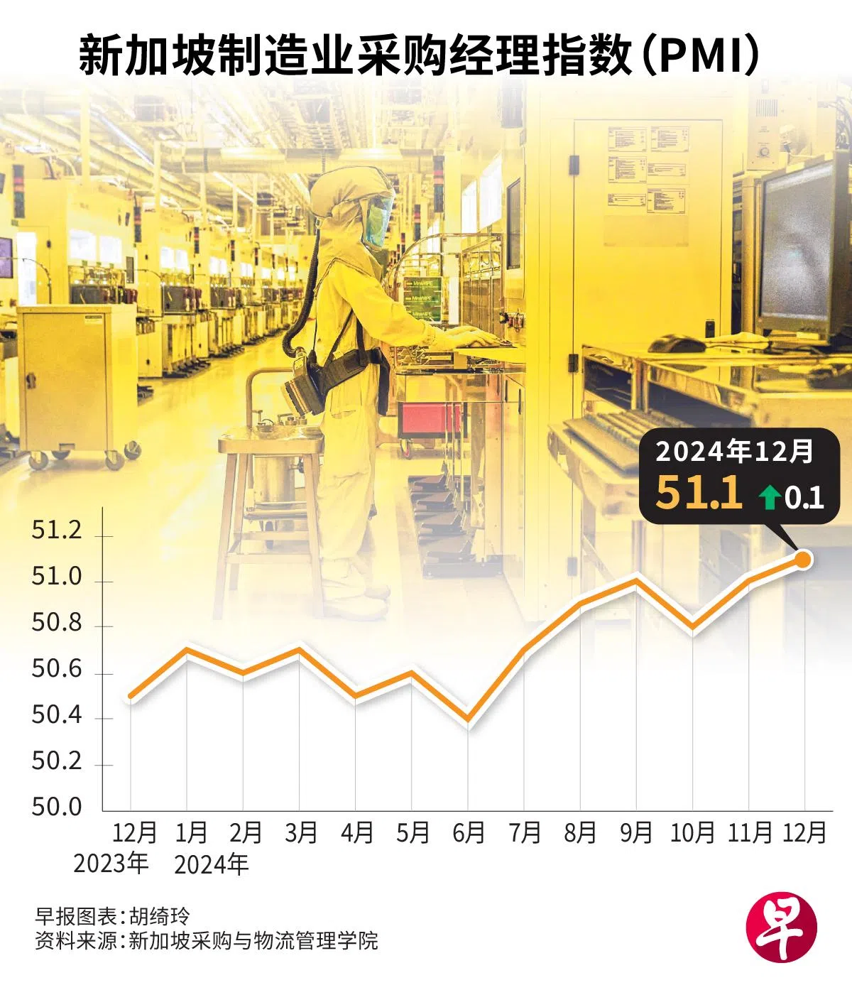 新加坡采购与物流管理学院(SIPMM)星期四(1月2日)发布的最新数据显示,我国2024年12月的制造业采购经理指数(PMI)微涨0.1至51.1。电子业采购经理指数则下滑0.2至51.4。