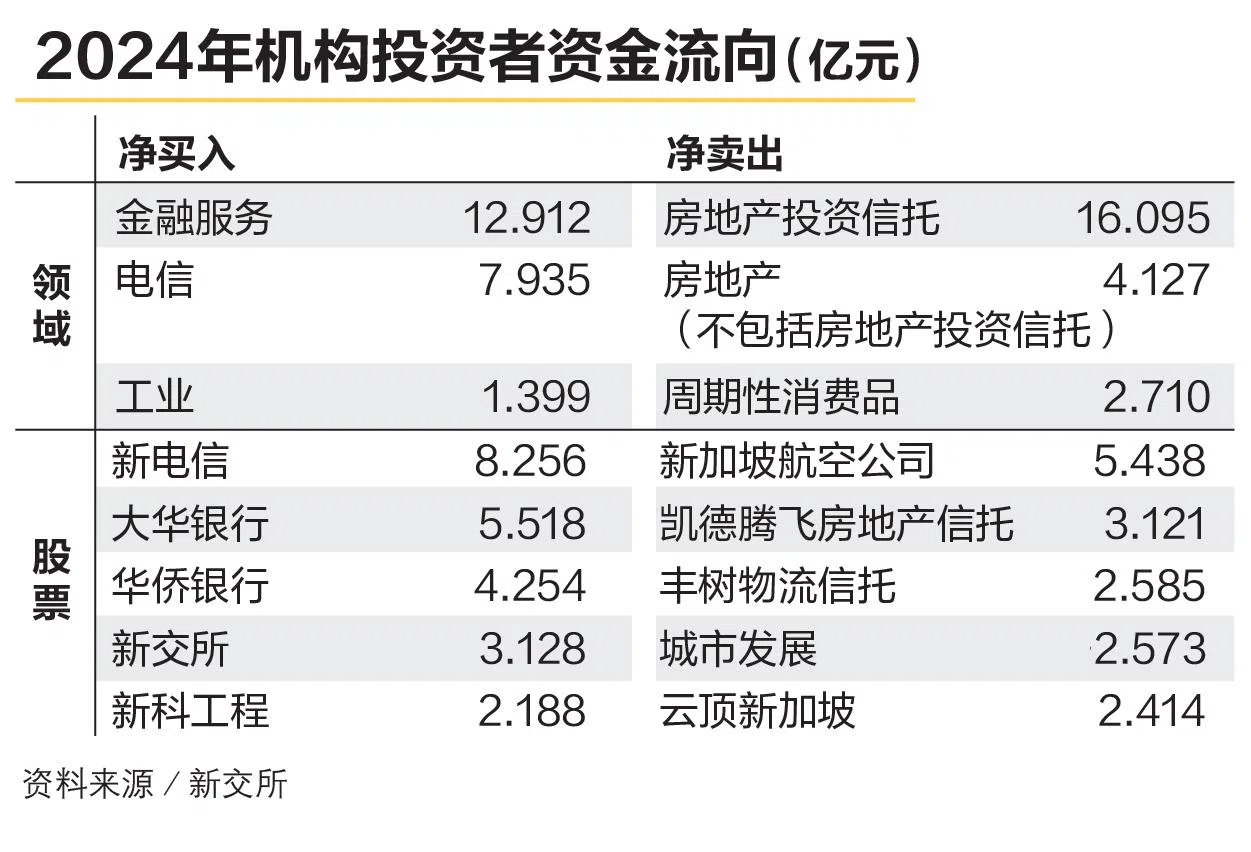 根据新加坡交易所提供给《联合早报》的数据,机构投资者在2024年一整年中净卖出本地股市的金额为3亿2830万元,而散户投资者则在本地股市净投入2亿零460万元。