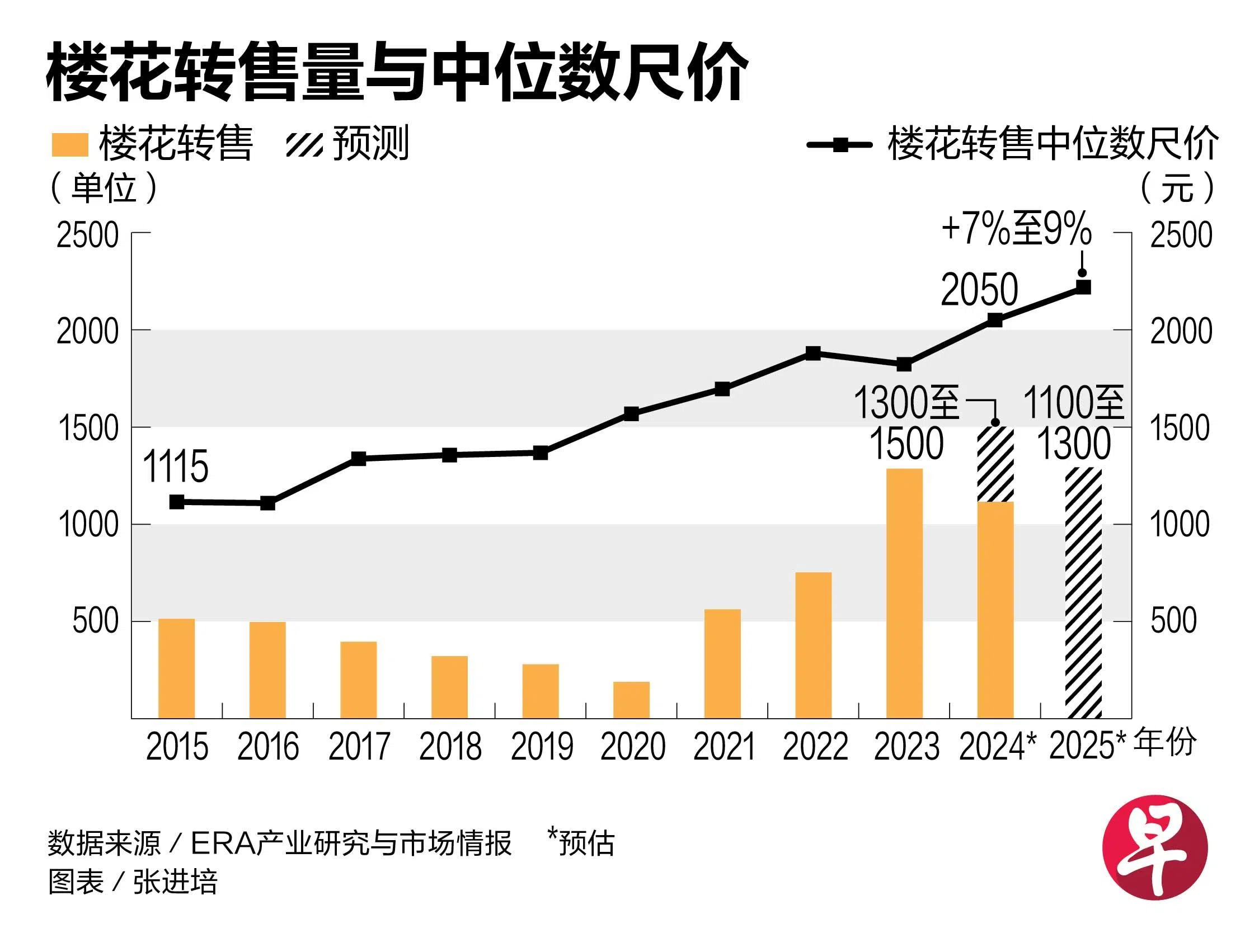 他说:“楼花转售价预计在2024年增长12%至13%, 2025年的转售量可达1100个至1300个,中位数价格预计增长7%至9%。”
