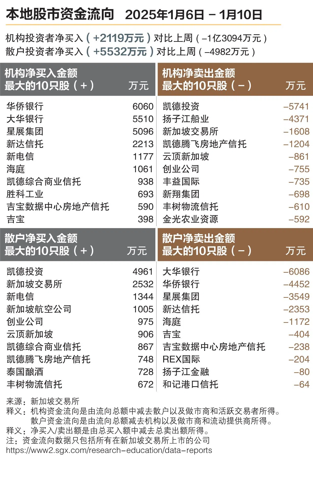 新加坡交易所数据显示,机构投资者上周净买入2119万元的股票。净买入金额最高的股票为华侨银行,净卖出金额最高的为凯德投资。散户投资者净买入5532万元,净买入金额最高的为凯德投资,净卖出金额最高为大华银行。