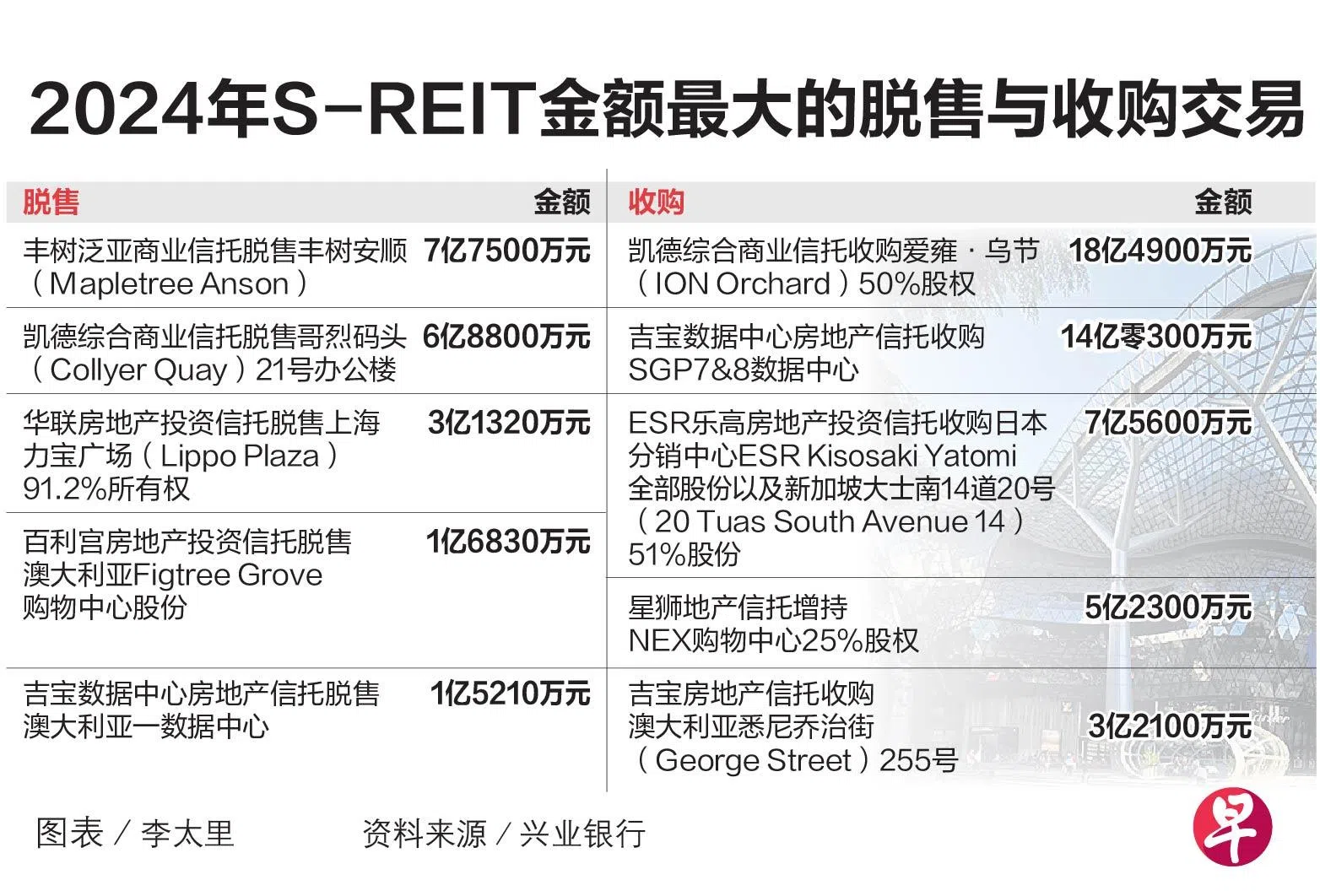新加坡房地产投资信托(S-REIT)2024年资产交易活跃,录得24笔,总价值达71亿元,是2023年的2.2倍。