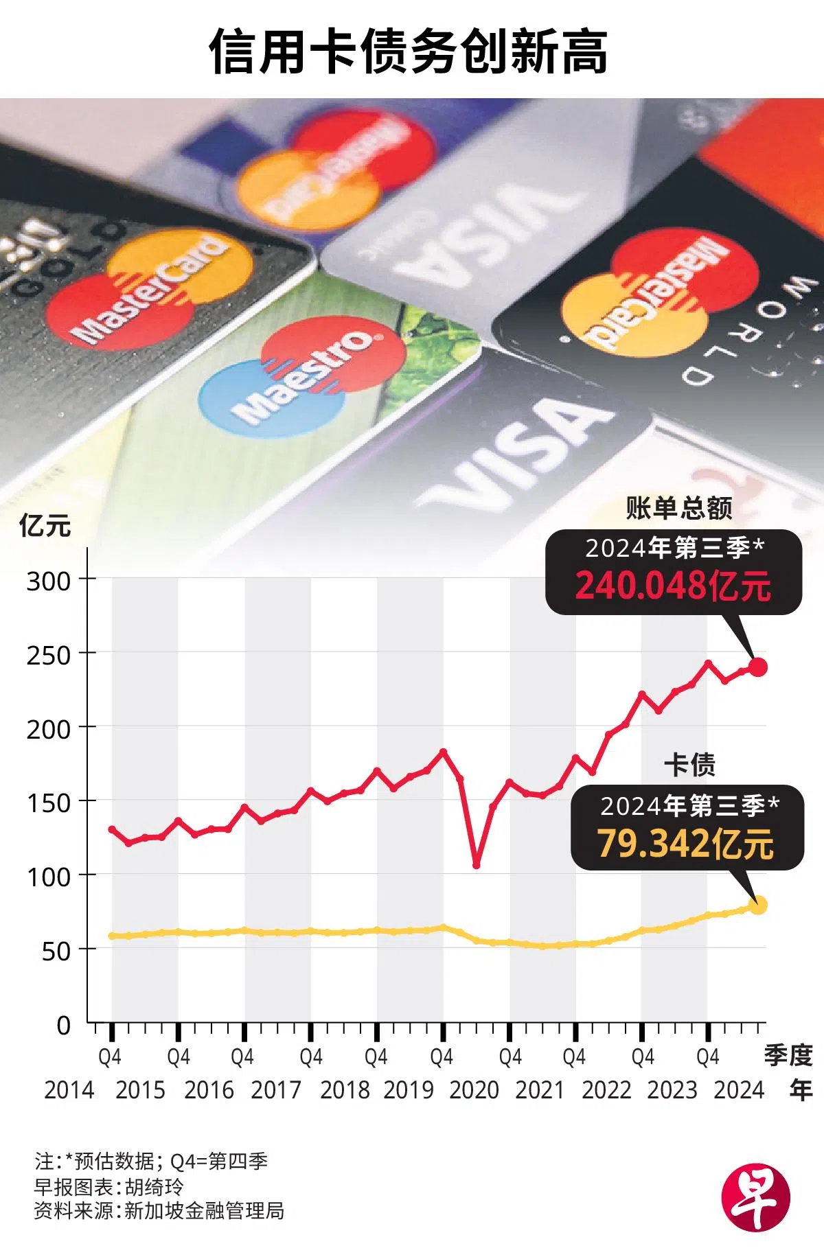 继信用卡转期账款(rollover balances,下称卡债)在去年第三季创下79亿3420万元的历史高峰后,受访的财务顾问普遍认为,由于年底季节因素等的推动,2024年第四季的卡债和信用卡账单总额(total card billings)预计将双双创下历史新高。