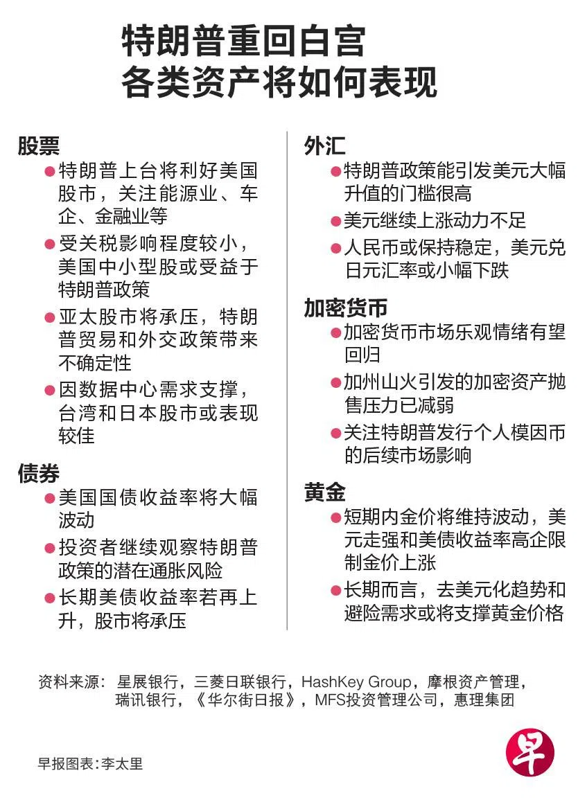 受访分析师认为,“美国优先政策”是“特朗普2.0”时代的标志之一,特朗普就职典礼前后,美国股市前景料优于其他市场,但有鉴于特朗普接下来的政策难以预测,从股市、汇市、债市到数码资产都面对更多不确定性。
