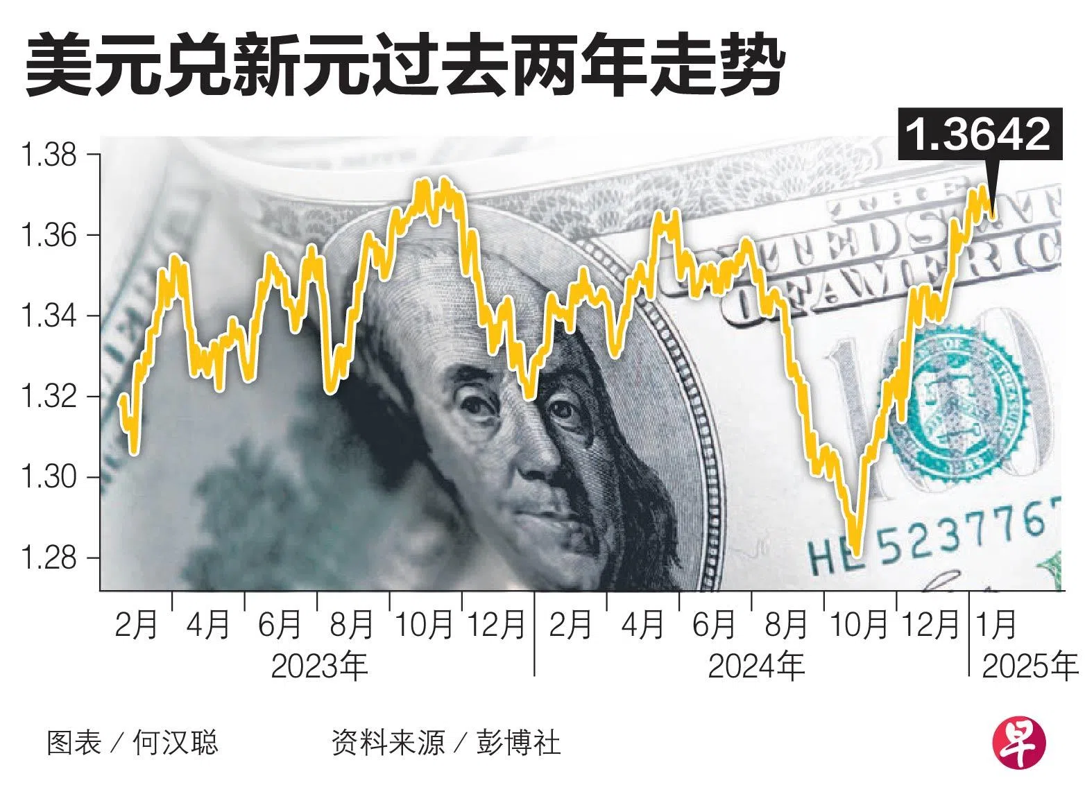 去年9月美联储首次减息后,美元兑新元当月一度触及1.28的低点,但特朗普的胜选和美国减息预期削弱,使得美元大幅走强,兑新元日前超越1.37水平,星期一处于1.36以上。