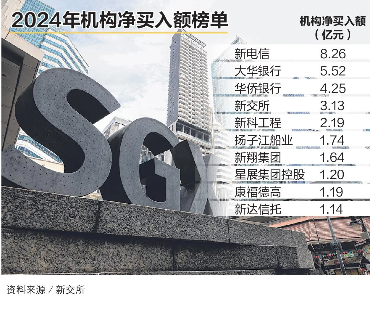 新加坡交易所(SGX)日前发布的报告,列出2024年机构净买入额最高的股票榜单,新电信位列榜首。
