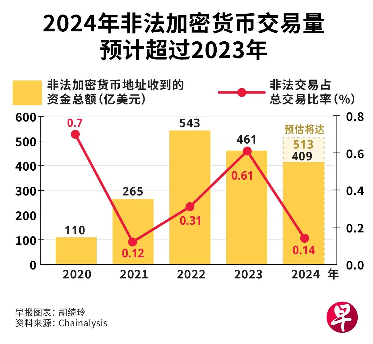 有研究机构估算,2024年全球非法加密货币交易量料超2023年,达510亿美元(约700亿新元),占加密货币交易总量的0.14%。