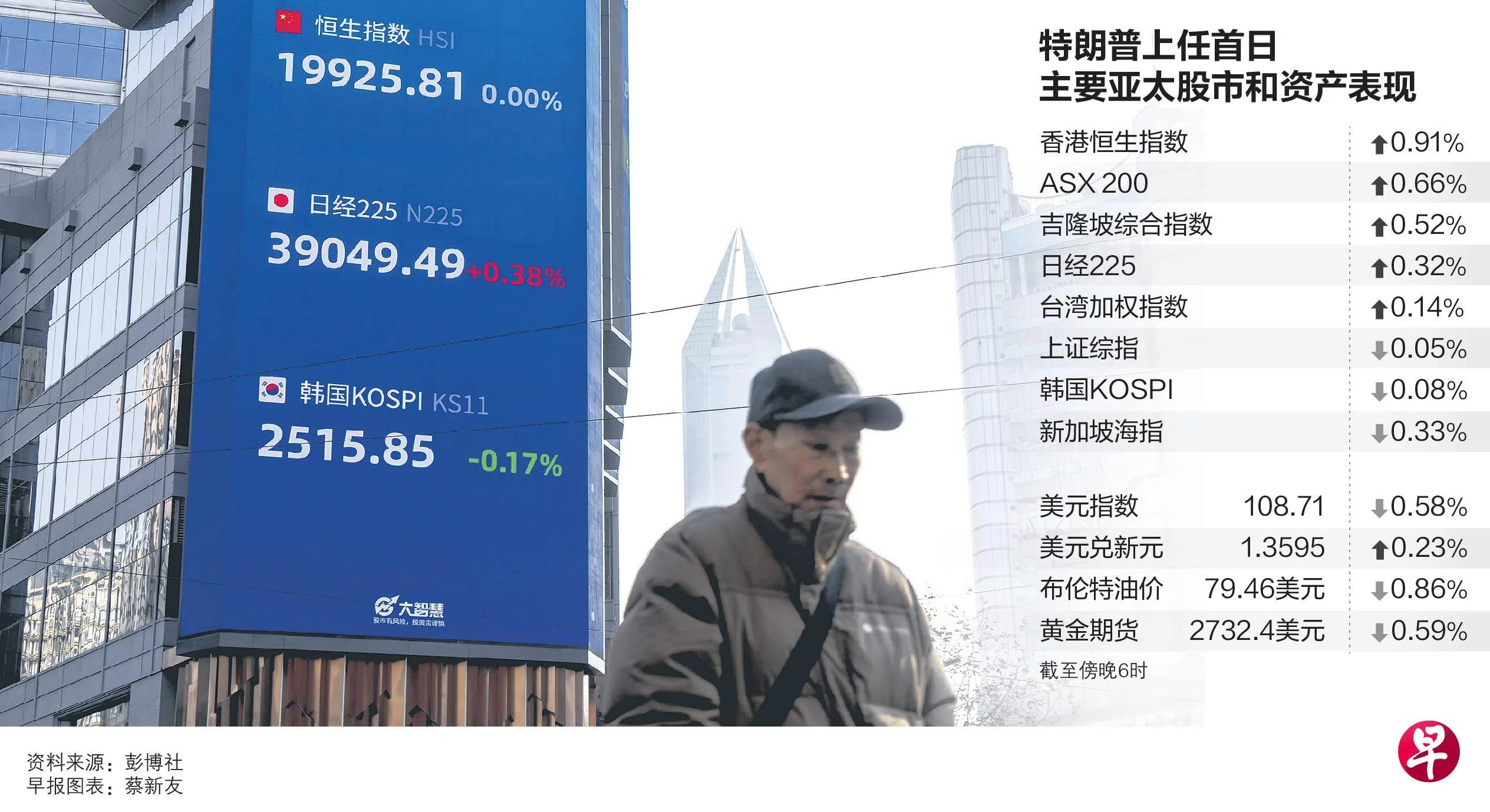 亚洲股市星期二(1月21日)喜忧参半。特朗普表明他将进行谈判,而不是立即对贸易伙伴征收高额关税,并且未提及对中国的关税,让中国大陆和香港股市高开,香港恒生指数以0.91%涨幅作收,上证综指回吐涨势后以0.05%跌幅收盘。新加坡股市开盘不久跌破3800点,收于3795.37点。