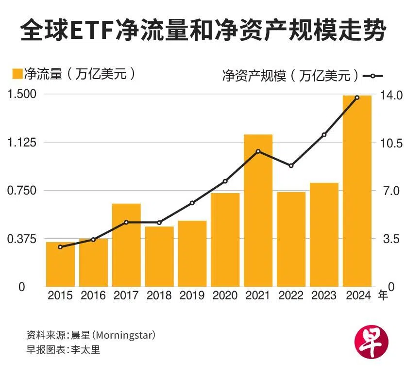 晨星近日发布的一份报告显示,2024年全球交易所挂牌基金(ETF)继续膨胀,净流入资金达到1.5万亿美元(约2.05万亿新元)的历史新高,而全球ETF的净资产规模也达到创纪录的13.8万亿美元,相比2023年增加了2.7万亿美元。