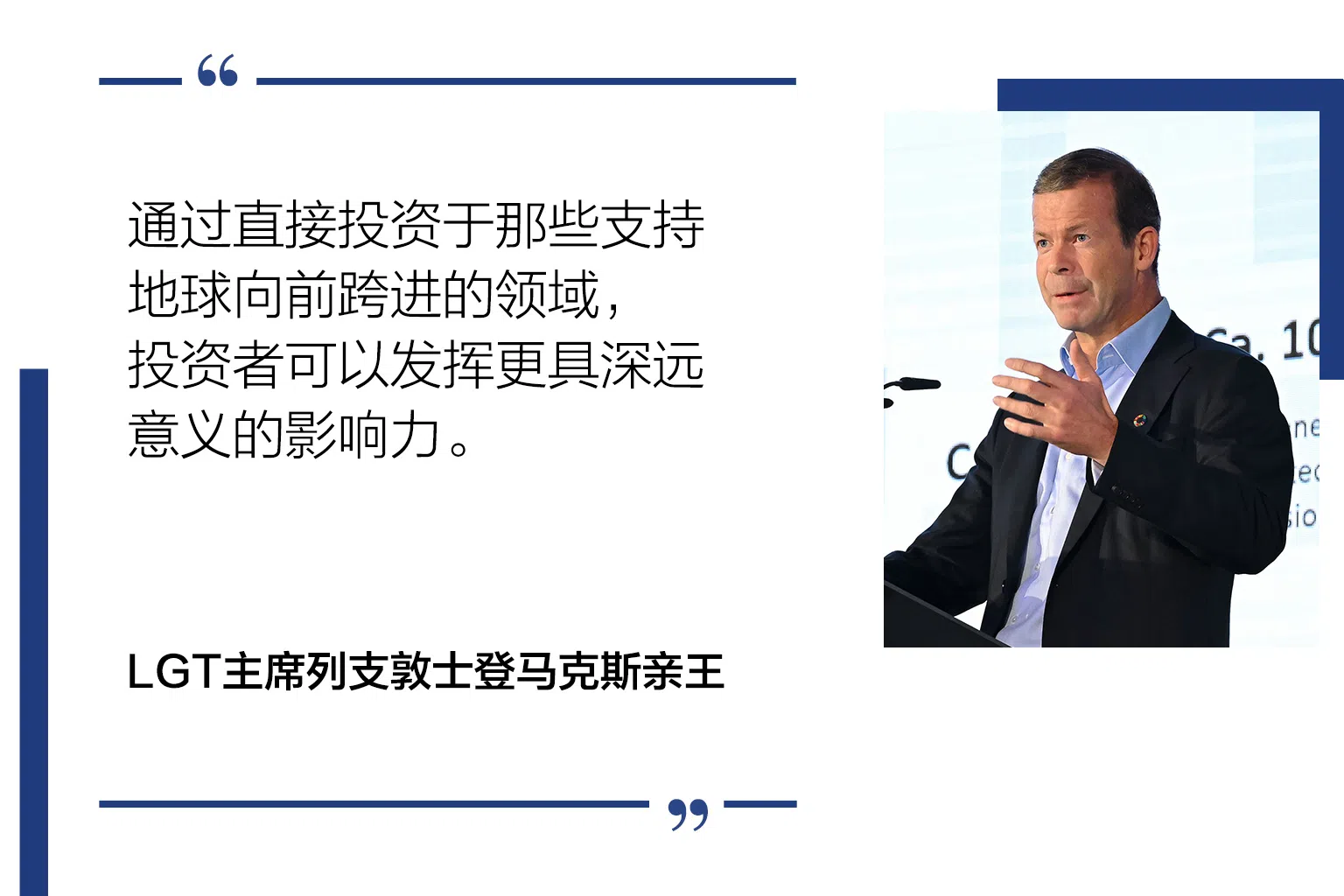 大会的重量级主讲嘉宾就包括了LGT主席列支敦士登马克斯亲王(H.S.H. Prince Max von und zu Liechtenstein),而圆桌论坛环节也汇聚了行业领袖的见解,包括LGT私人银行首席执行官奥利维耶·佩雷戈(Olivier de Perregaux)和Lightrock首席执行官帕尔·斯亚蒂尔(Pal Erik Sjatil),重点探讨了企业和投资者如何采取可行的步骤,将财务回报与环境责任相结合。
