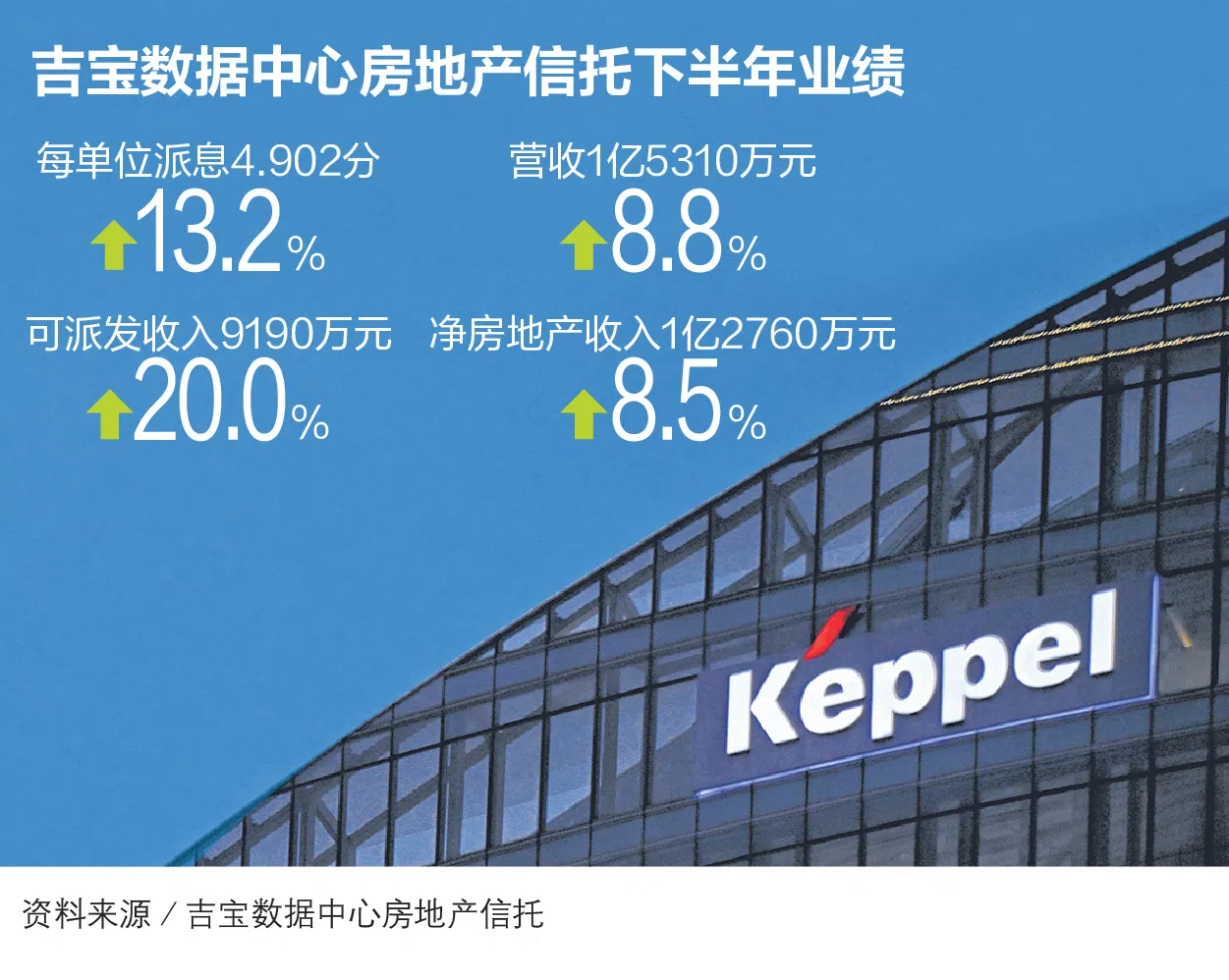 吉宝数据中心房地产信托星期五发布的业绩显示,在截至去年12月底的下半年每单位派息(DPU)为4.902分,同比上涨13.2%。全年来看,信托的DPU达到9.451分,同比上涨0.7%。