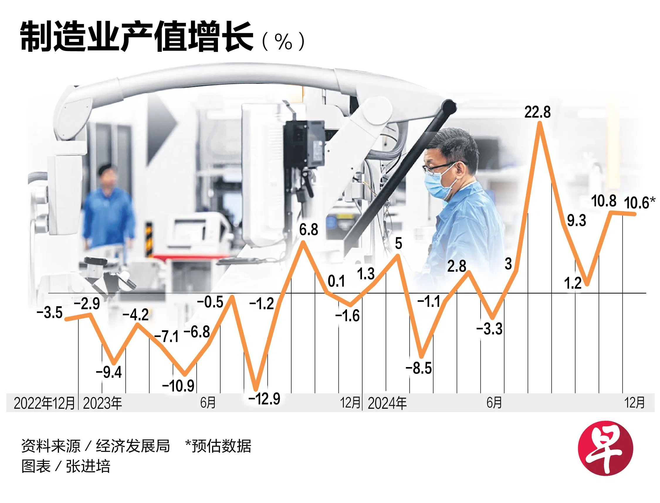 在12月份和2024全年,生物医药制造业产值同比增长9.4%和萎缩12.5%;精密工程业产值同比增长3.9%和2.3%;一般制造业产值同比增长3.7%和1.3%;化学业产值同比增长3.1%和4.3%。